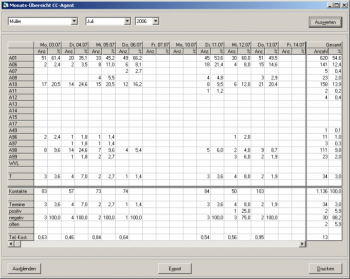 In der Tabelle werden die Anzahl der Besuchstermine nach Beurteilungen für jeden Arbeitstag aufgelistet. Die möglichen Beurteilungen werden - so wie definiert - links aufgelistet. Zunächst werden die negativen Beurteilungen, dann (durch eine Leerzeile getrennt) die positiven angegeben. In den beiden rechten Spalten (unter der Überschrift „Gesamt“) werden die Monats-Summen für die jeweilige Bewertung sowie ein Prozentsatz ausgegeben. Die Prozentsätze in der Haupt-Tabelle sowie die für die Monats-Summen beziehen sich auf die Tages- bzw. die Gesamt-Summen in den unteren Tabellen.