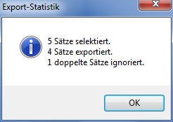 Nach dem erfolgreichen Export wird ein Statusbericht ausgegeben. Sofern die Kriterien der gewählten Selektierung Partner-Daten beinhalten (z.B. Selektierungs-Kennzeichen), das Datei-Format aber nur Felder der Firma bzw. der Niederlassung enthält, werden auch nur die im Datei-Format definierten Felder ausgegeben. Durch die Kriterien eventuell mehrfach selektierte Datensätze (bei mehreren Partnern pro Niederlassung) werden ignoriert.