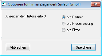 Über diese Schaltfläche wird eine Maske angezeigt, in der Sie für die aktuelle Firma definieren können, auf welche Art die Kontakt-Historie angezeigt wird. Damit können Sie für eine spezielle Firma die in der Maske Einstellungen hinterlegte Anzeige-Art überschreiben. Unabhängig davon kann die Anzeige natürlich jederzeit temporär über das Popup-Menü der Maske Kontakt-Historie geändert werden.