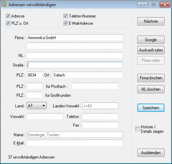 Neu gegründete Firmen findet man oft nicht auf Telefon-CDs und auch nicht im Internet. Letzte Möglichkeit ist dann die Auskunft, die Sie über die entsprechende Schaltfläche anrufen können. Dafür wird die Auskunfts-Nummer verwendet, die in der Konfiguration definiert wurde. Um die genaue Postanschrift zu erhalten, können Sie auch - sofern die Telefonnummer bekannt ist - die Firma selbst anrufen. Sollten Sie aber erfahren, dass die Firma die aktuelle Niederlassung geschlossen hat oder gar die Firma nicht mehr existiert, können Sie auch - sofern Sie die entsprechenden Berechtigungen besitzen - Datensätze löschen.