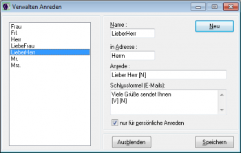 In der linken Liste sehen Sie die Namen aller bereits definierten Anreden.