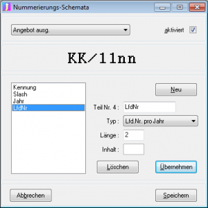 Bei der Verwaltung von Projekten und Vorgängen, die ja meist fortlaufend nummeriert werden bzw. sogar nummeriert werden müssen (Rechnungen), ist es hilfreich, die zuletzt verwendete bzw. die nächste freie Nummer eines Vorgangs zu wissen. Da fast jedes Unternehmen ein anderes System bei der Nummerierung verwendet, kann in dieser Maske für jeden Vorgangs-Typ ein Nummerierungs-Schema hinterlegt werden. Damit kann