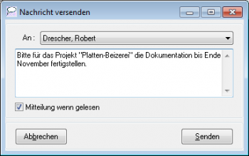 In der Combobox wählen Sie den Empfänger aus, dem Sie die Nachricht senden wollen. Nach dem Erfassen der eigentlichen Nachricht können Sie noch bestimmen, ob Sie davon informiert werden wollen, wenn der Empfänger die Nachricht gelesen hat. Durch Betätigen der Schaltfläche