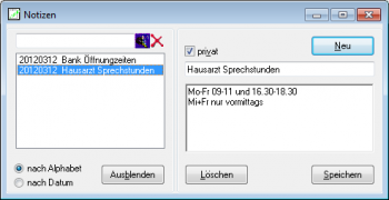 Im linken Teil sehen Sie eine Liste der gespeicherten Notizen sortiert nach dem Datum, an dem sie gespeichert bzw. geändert wurden. Sie können jederzeit zwischen einer alphabetischen Sortierung und der Sortierung nach Datum umschalten. Klicken Sie eine der Notizen an, um rechts den vollen Text zu sehen.