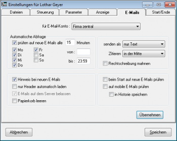 - E-Mails: Abruf-Intervall neue Mails und Standard-Text, der an jede E-Mail angehängt wird