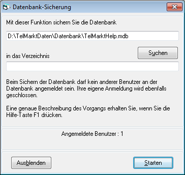 -Datenbank wird nur für Access-Datenbanken unterstützt. Beim Einsatz von SQLServer wird die Datensicherung durch den Enterprise Manager durchgeführt.