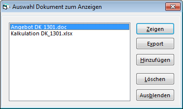 Durch Betätigen der Schaltfläche Dokumente erscheint zunächst eine Maske, in der Sie ein Dokument auswählen können. Diese Maske kann auch durch einen Doppelklick auf die Spalte „Anzahl Dokumente“ in der Tabelle der Kontakte geöffnet werden, sofern diese angezeigt wird (siehe Einstellungen, Anzeige). Das Dokument kann dann angezeigt werden (dazu wird das im Betriebssystem über den Dateityp definierte Anzeigeprogramm aufgerufen) oder in ein frei wählbares anderes Verzeichnis exportiert werden.