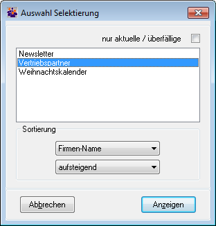Mit dieser Option können Sie die Liste auf jene Selektierungen einschränken, für die zum aktuellen Datum oder früher Anrufe mit Wiedervorlage zu tätigen sind.