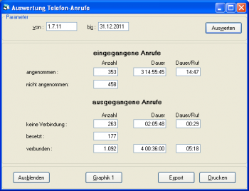 Die Tabelle gibt Auskunft über die Anzahl der geführten Telefonate, deren durchschnittliche und gesamte Dauer. Sie zeigt außerdem, wie viele Versuche gestartet wurden und bei wie vielen Versuchen die angerufene Nummer besetzt war.