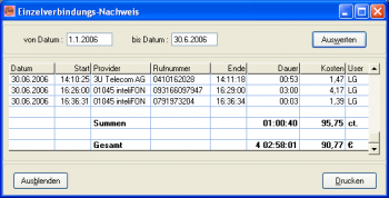 In der Tabelle werden Zwischensummen und Endsummen für die Gesprächsdauer und die angefallenen Kosten ausgegeben. Die Zwischensummen werden je nach Sortierung der Tabelle pro Tag, pro Provider usw. ermittelt.