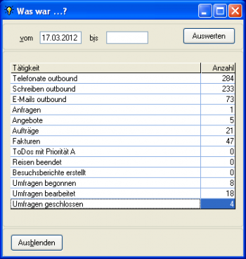 In dieser Maske können Sie für einen definierbaren Zeitraum alle relevanten Summen abrufen. So erhalten Sie einen schnellen Überblick über durchgeführte Aktivitäten, eingegangene Aufträge usw.