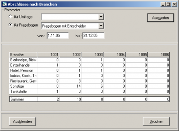 Diese Maske schlüsselt für eine Umfrage oder für alle Umfragen eines Fragenbogens Ihre Außendienst-Beurteilungen nach Branchen auf. Haben Sie z.B. in den Beurteilungen Ihre Produktgruppen „versteckt“, zeigt Ihnen diese Tabelle, wie Ihre Produktgruppen in den einzelnen Branchen abgesetzt wurden.