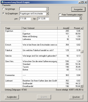 In dieser Maske werden die Antworten zu einzelnen Fragen ausgewertet und tabellarisch und graphisch dargestellt.