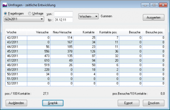 Diese Auswertung ist vor allem interessant für Umfragen, mit denen Termine für den Außendienst vereinbart werden. Sie gibt eine Übersicht über die Entwicklung der Anzahl der Anrufe innerhalb von Umfragen, der Anzahl der positiven Bewertungen sowie der durchgeführten Besuche durch den Außendienst und deren positives Ergebnis.