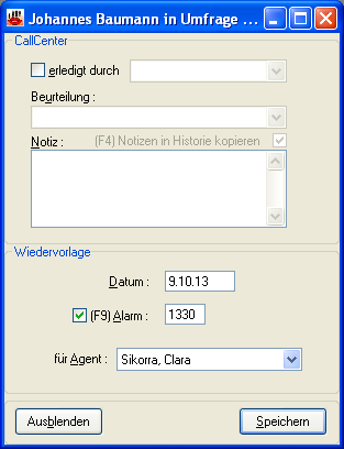 Ist bei der Umfrage die Vereinbarung von Terminen für den Außendienst vorgesehen, können die entsprechenden Daten hier nachträglich erfasst bzw. geändert werden. Für die Felder gelten die selben Regeln wie bei der Erfassung während der Umfrage.