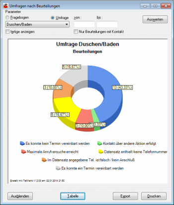 In dieser Maske werden die beim Durchführen von Umfragen gegebenen Beurteilungen ausgewertet und tabellarisch und graphisch dargestellt.