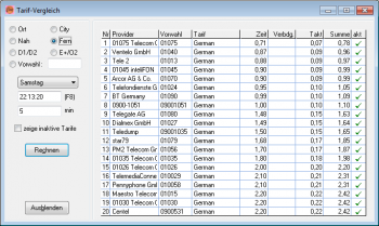 In dieser Maske erhalten Sie eine Übersicht über die 20 günstigsten Tarife. Während bei der Ermittlung des günstigsten Providers vor jedem Anruf nur jene Tarife berücksichtigt werden, die Sie auch nutzen können, können hier alle gespeicherten Tarife aufgelistet werden. Auch jene, für die Sie sich z.B. nicht angemeldet haben. Damit können Sie prüfen, ob es eventuell sinnvoll ist, sich bei einem Provider für einen CallByCall-Tarif anzumelden.