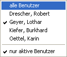 Angezeigt werden zunächst nur die Namen der aktiven (vom Administrator nicht gesperrten) Benutzer. Sind auch Benutzer definiert, die nicht (mehr) aktiv sind, wird zum Schluss der Liste ein Menüpunkt angezeigt, mit dem Sie die Anzeige auch dieser Benutzer an- bzw. abschalten können. Dies erfolgt natürlich nur in Masken, in denen das auch sinnvoll ist - also z.B. nicht beim Planen von Kontakten, sehr wohl aber in der Kontakt-Historie.