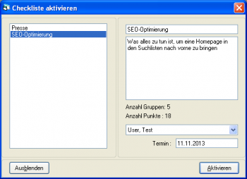 Checklisten mit dem Status „freigegeben“ können für eine Kontaktperson oder ein Projekt aktiviert werden. Bei der Aktivierung kann angegeben werden, durch welchen Benutzer sie bis wann zu erledigen ist. Wird die Bearbeitung an einen anderen Benutzer delegiert, wird dieser über eine Nachricht auf dem internen Nachrichtenkanal von