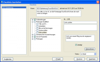 Der aktuelle Stand einer Checkliste kann jederzeit ausgedruckt werden. Dabei wird bei erledigten Punkten der Zeitpunkt ausgegeben, zu dem der Punkt als „erledigt“ gekennzeichnet wurde.