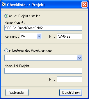 Bei der Umwandlung kann aus der Checkliste ein neues Projekt erstellt oder die Checkliste als Teil-Projekt in ein bestehendes Projekt eingefügt werden. Dabei werden