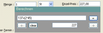 Dazu kann man mit einem Doppelklick auf das Feld Einzel-Preis ein Fenster einblenden, in dem man eine Berechnungs-Formel eingeben kann. Das Ergebnis wird nach einem Klick auf die =-Schaltfläche angezeigt und kann mit der Schaltfläche → in das Feld Einzel-Preis übernommen werden. Darauf hin wird der Gesamtpreis ausgegeben.