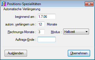 | beginnend am | In der eigentlichen Position erfassen Sie die Zeit vom Abschluss des Vertrages bis zum Ende des Jahres, also in unserem Beispiel für 6 Monate. Die Verlängerung beginnt also am 1. Januar des Folgejahres. Dieses Datum tragen sie hier ein. |
