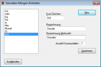 Mit dieser Maske können Sie - falls Ihnen die bereits vordefinierten nicht genügen - Mengeneinheiten verwalten, die Sie dann bei der Definition von Standardpositionen, also Artikeln oder Leistungen verwenden können.