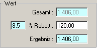 Sofern Positionen zu dem Vorgang erfasst wurden (wie in diesem Beispiel), errechnet sich der Wert aus der Summe der Positionen und kann hier nicht geändert werden. In dem Beispiel wurde ein Rabattwert in Höhe von 120,00 Euro eingegeben. Alle anderen Werte errechnen sich also und sind deshalb blau hinterlegt. Sie könnten nun den Rabattprozentsatz auf 10 % ändern. Dadurch würden dieses Feld weiß, der errechnete Rabattwert ausgegeben und dessen Feld blau hinterlegt. (Das Ergebnis würde natürlich entsprechend angepasst.) Oder Sie könnten direkt das Ergebnis eingeben (das Feld wird weiß) und der sich daraus ergebende Rabatt wird in % und als Euro-Wert ausgeben (die Felder werden blau).